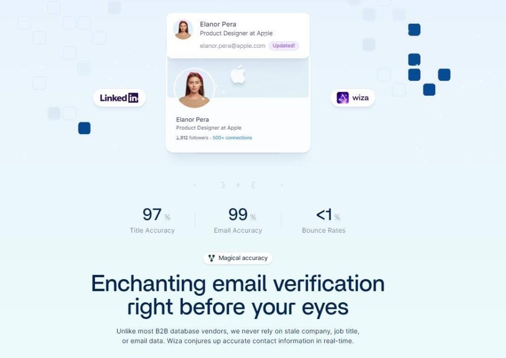 Wiza made the top of my list because it ticks all the boxes of an outstanding contact finder – and ticks them well. It’s feature-rich, including real-time email verification. When comparing Wiza’s data accuracy with similar tools, Wiza came up trumps every time.